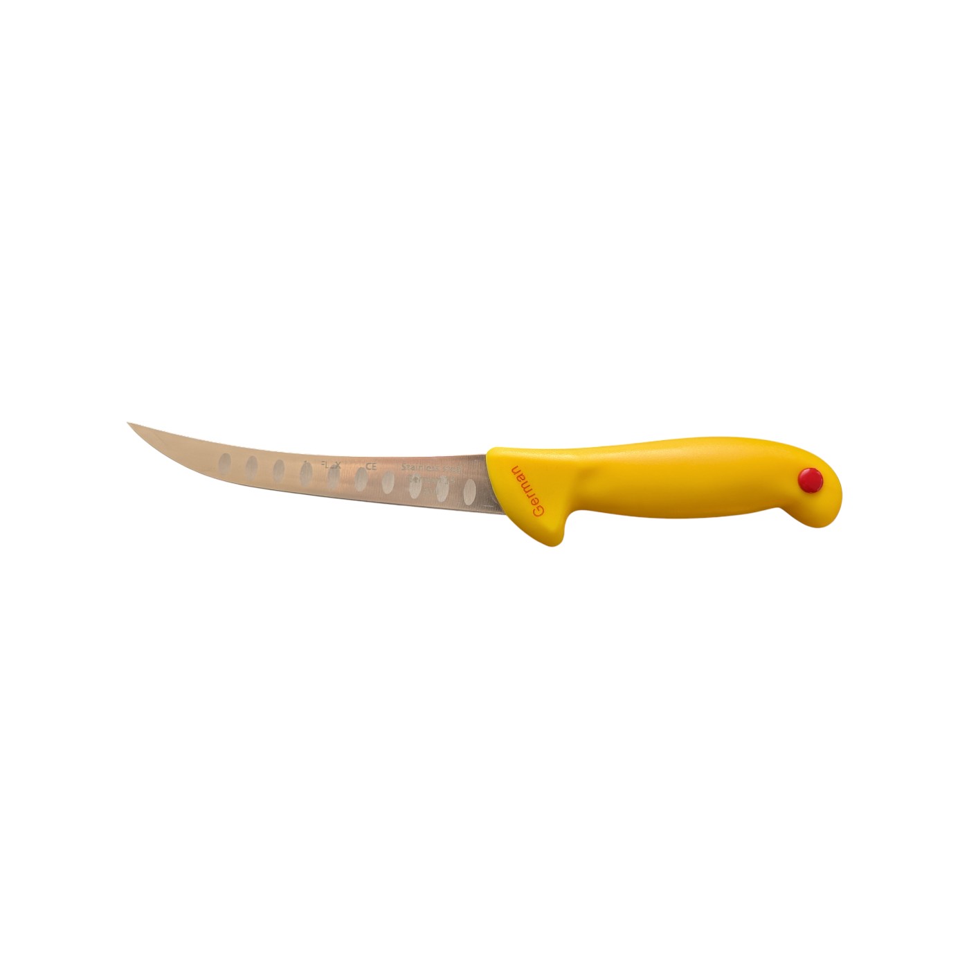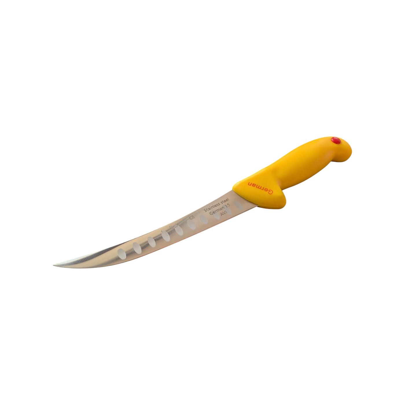 Acest cutit profesional pentru macelarie este conceput pentru utilizare intensiva, oferind precizie si control excelent in operatiunile de tranare si prelucrare a carnii. Lama de 5 inch, realizata din otel inoxidabil, asigura durabilitate ridicata si rezistenta la coroziune. Forma filetata faciliteaza miscari rapide si eficiente.