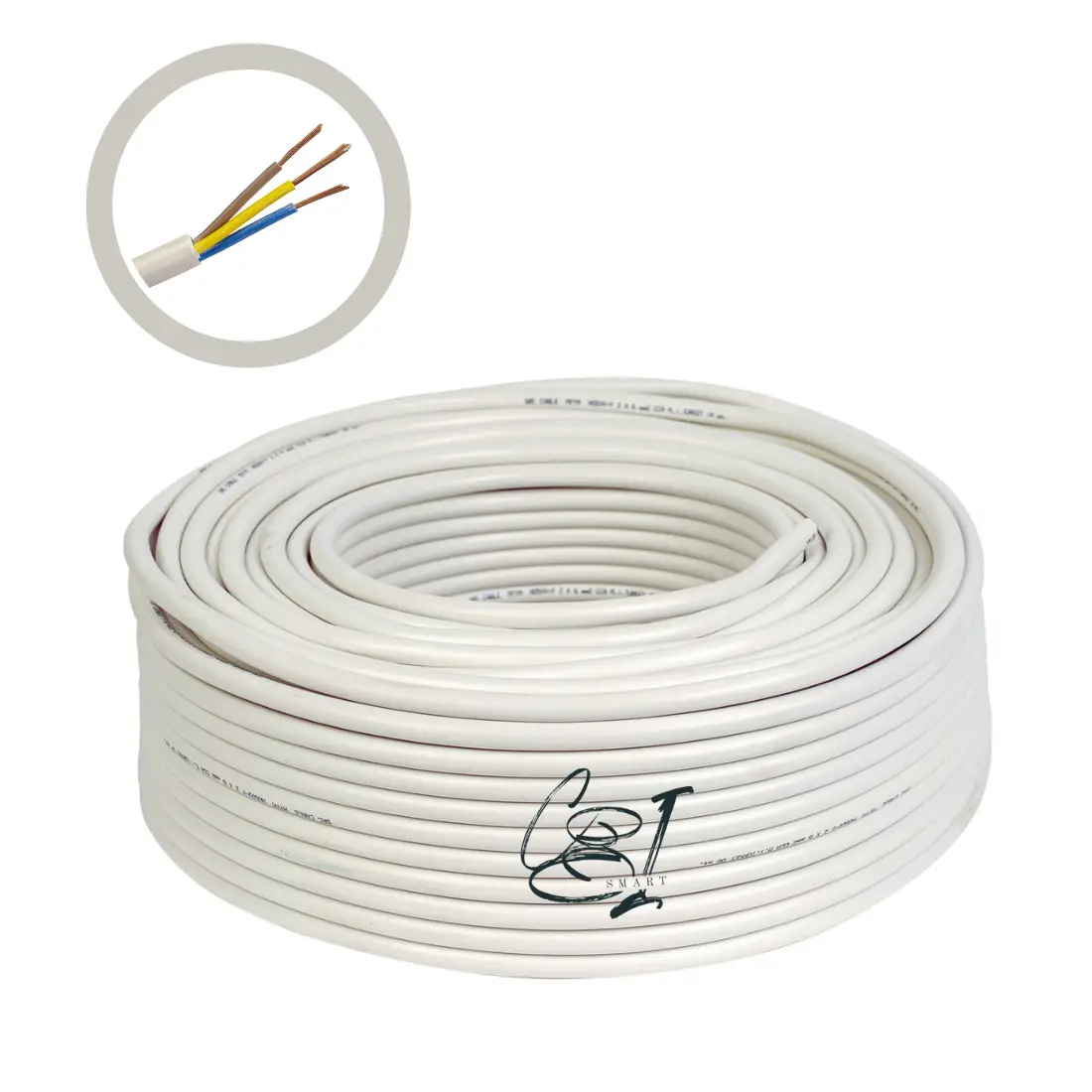 Cablu electric multifilar 3x1.5mm, cu o lungime de 100 metri și manta exterioară de culoare albă, destinat utilizării în instalații electrice de joasă tensiune. Ideal pentru circuite de iluminat, prize, comenzi sau alimentări auxiliare, atât în spații rezidențiale, cât și comerciale.