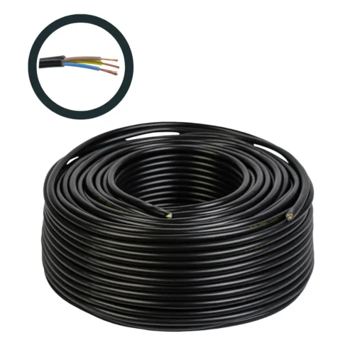 Cablu electric multifilar 3x2.5mm, cu o lungime de 100 metri și manta exterioară de culoare neagră, conceput pentru instalații electrice de joasă tensiune în spații interioare. Este ideal pentru circuite de prize, alimentarea aparatelor electrocasnice și distribuții monofazate, fiind potrivit pentru clădiri rezidențiale și comerciale.