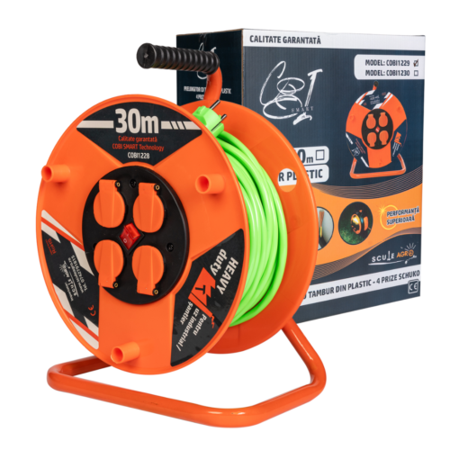 Prelungitorul cu tambur COBI SMART® este conceput pentru utilizare profesionala si casnica, oferind o solutie sigura pentru alimentarea echipamentelor electrice la distante mari. Cablul de 30 m si sectiunea de 3x2.5 mm² asigura o capacitate mare de curent si performanta stabila in orice mediu de lucru.