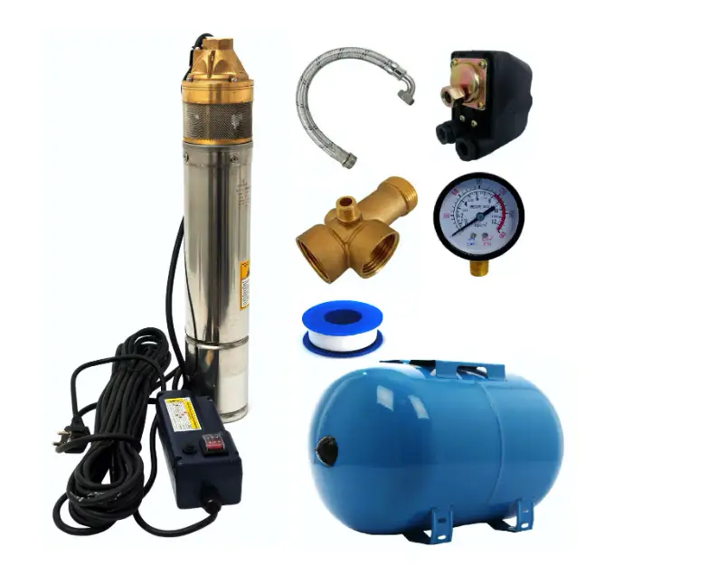 Kit hidrofor COBI SMART® cu vas de 50 litri si pompa submersibila model 4SKM-100, cu putere de 0.75 KW, este solutia ideala pentru alimentarea cu apa in gospodarii si gradini. Pompa poate asigura o inaltime de refulare de 70 metri si un debit de 2.7 metri cubi pe ora.