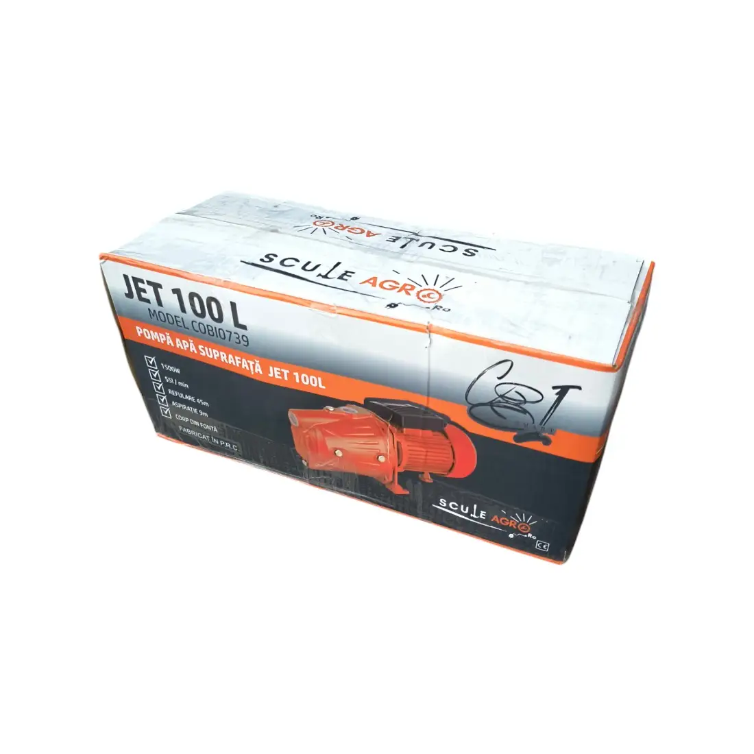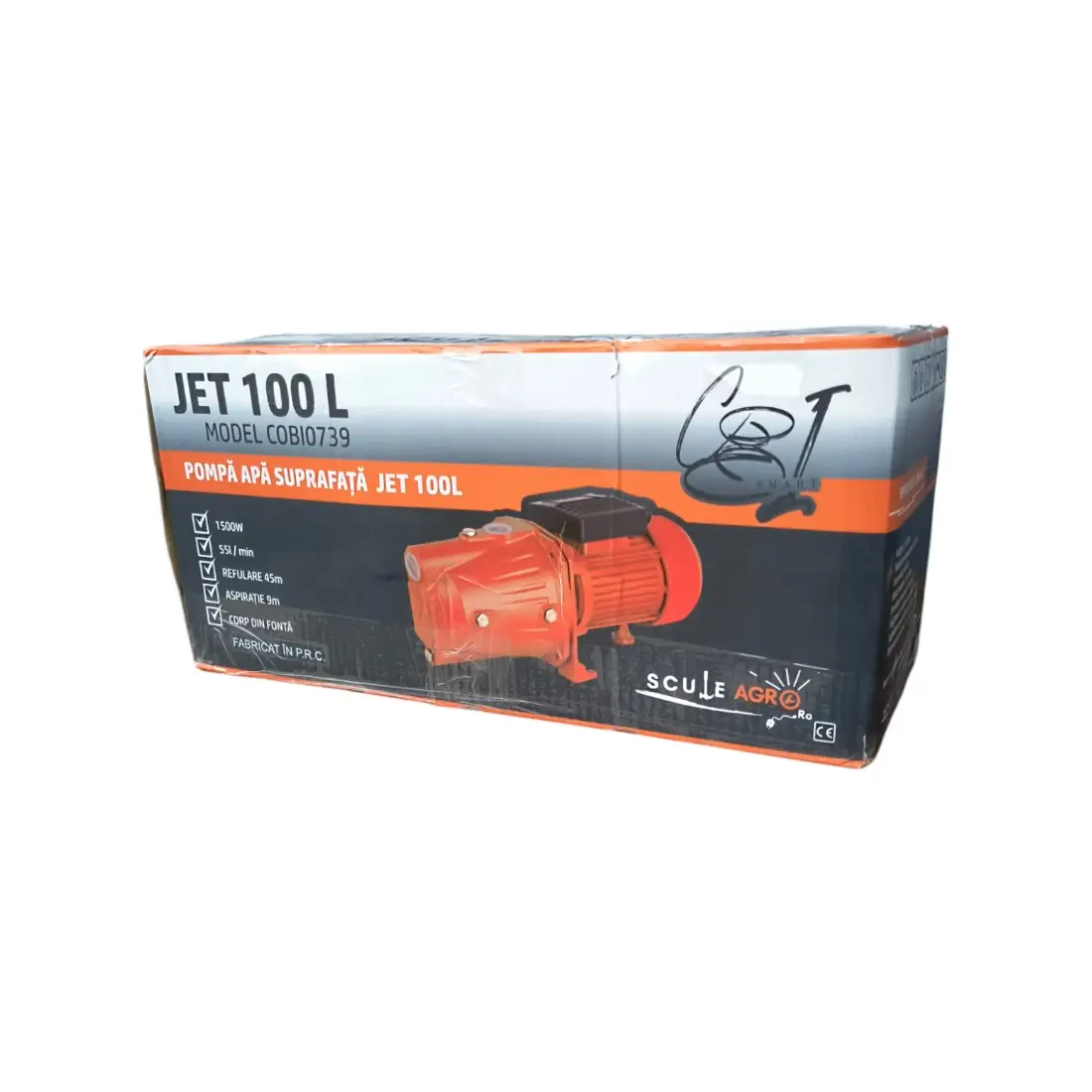Pompa de suprafata COBI SMART®, model JET100L, este proiectata pentru aplicatii diverse, oferind o putere de 1.5 KW (2.01 cai putere) si o turatie de 2850 rpm. Aceasta poate pompa apa la o inaltime maxima de 45 metri si aspira de la adancimi de pana la 9 metri, asigurand performanta constanta si fiabila.