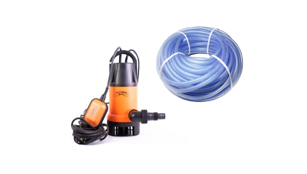 Acest set complet include o pompa submersibila pentru apa murdara de 900 W, proiectata pentru drenaj si evacuarea apei din subsoluri, puturi, gropi sau rezervoare. Cu un debit de 1.5 mc/h, refulare de 8 m si adancime maxima de 9 m, pompa ofera performanta stabila si siguranta in utilizare. Pachetul este completat de un furtun de 50 m, ideal pentru extinderea traseului de evacuare.