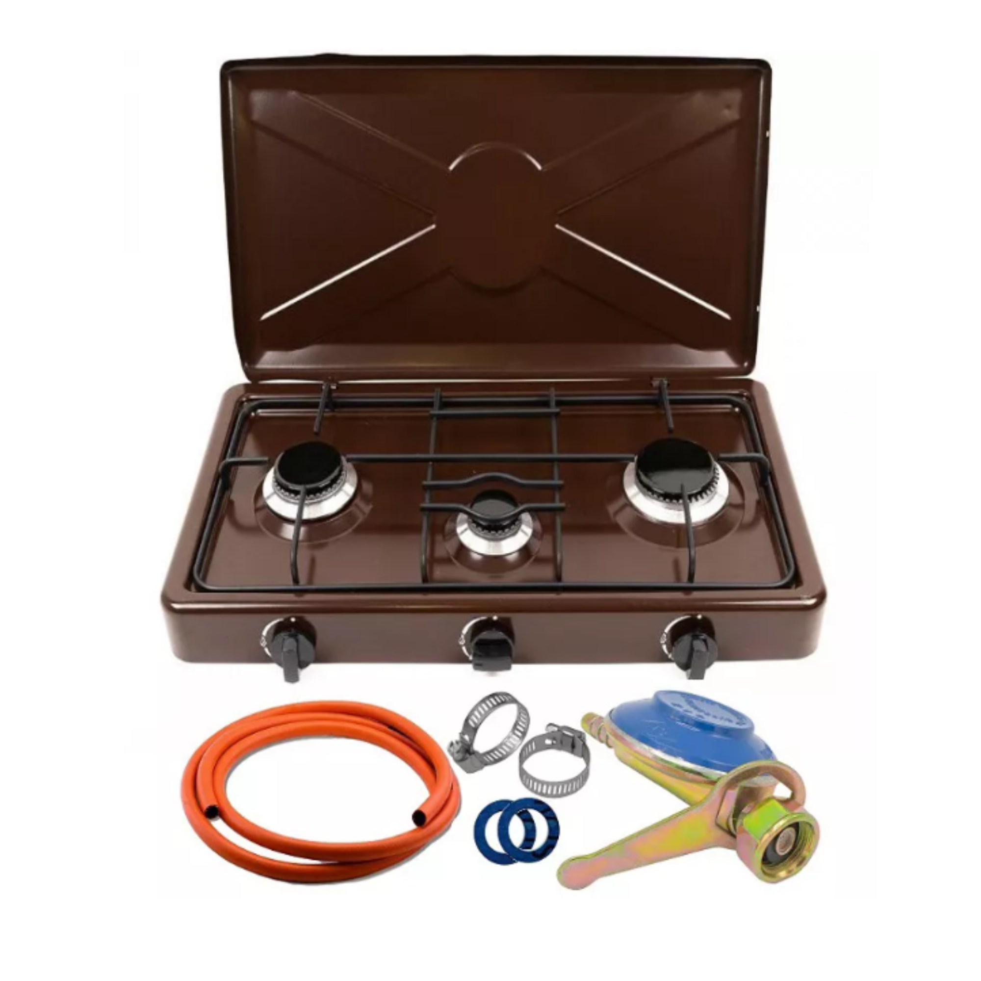 Pachet complet COBI SMART® care conține aragaz cu plita de 3 ochiuri, cu puteri de 1.9 kW, 1.5 kW și 0.9 kW, alimentat la butelie GPL. Setul include furtun gaz portocaliu de 2 metri, ceas butelie rusesc și 2 coliere pentru o instalare sigură și eficientă.