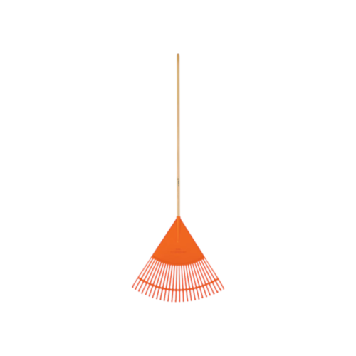 Grebla din plastic tip evantai cu coada din lemn, latime 45 cm si 20 dinti flexibili. Ideala pentru adunarea frunzelor si curatarea gazonului fara a deteriora iarba.
