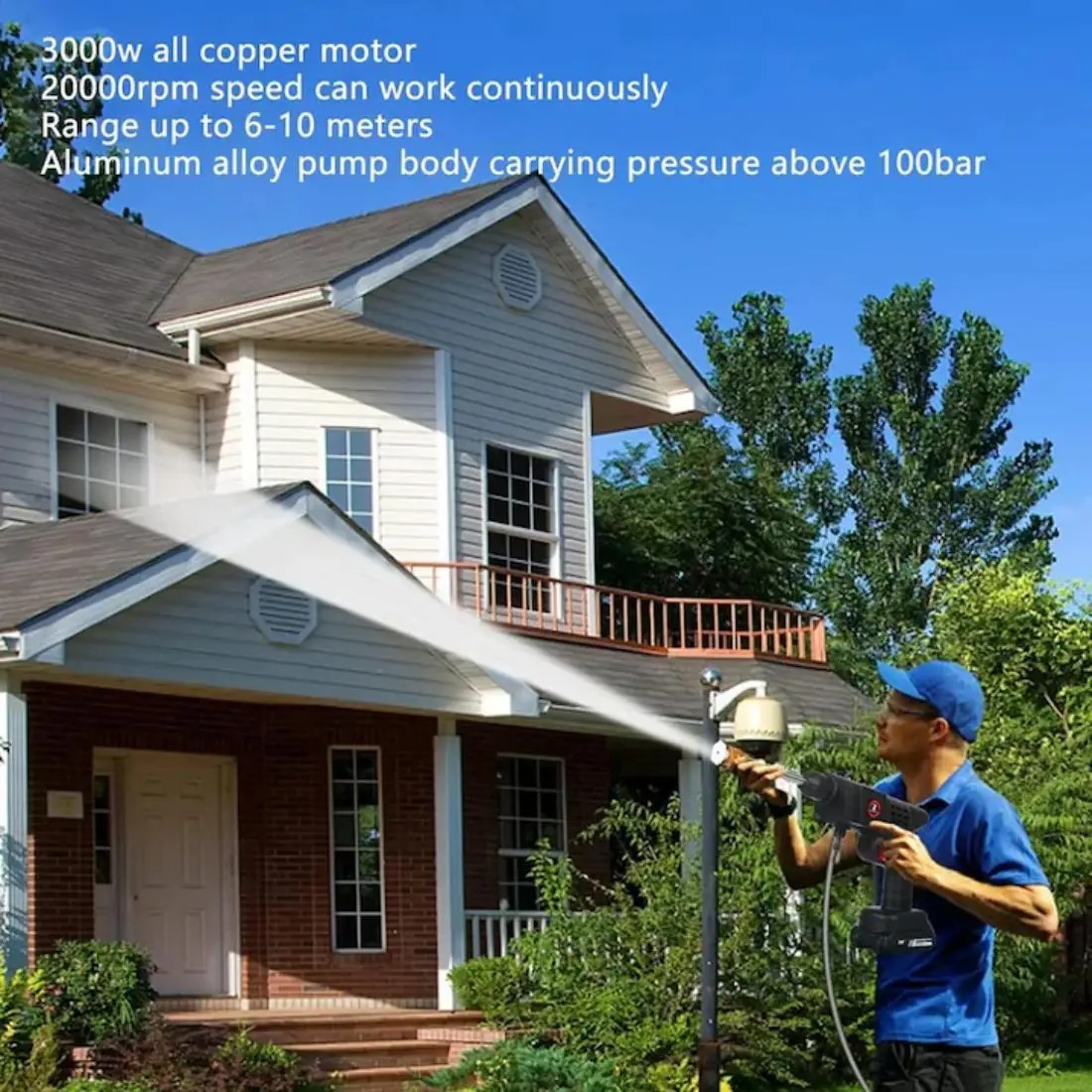 Aparat spalat cu presiune tip pistol fara fir, cu putere de 500 W si presiune de 30 bari. Ofera 3 moduri de pulverizare si este echipat cu 2 acumulatori 48V pentru autonomie ridicata. Include accesorii complete pentru spalare eficienta.
