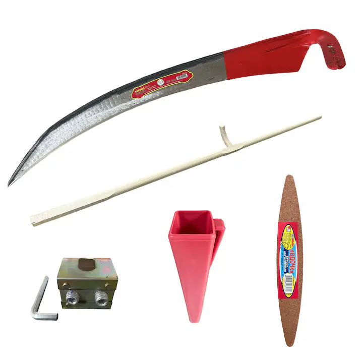 Set complet coasa manuala Saiga fabricata in Rusia, cu lama de 60 cm si coada robusta din lemn de 190 cm. Setul include inel de fixare pentru montaj stabil, piatra pentru ascutit lama si teaca pentru depozitarea pietrei, oferind un pachet complet pentru utilizare si intretinere eficienta.
